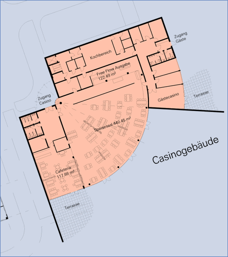 Es stehen hier eine komplett möblierte Cafeteria sowie Speisesaal